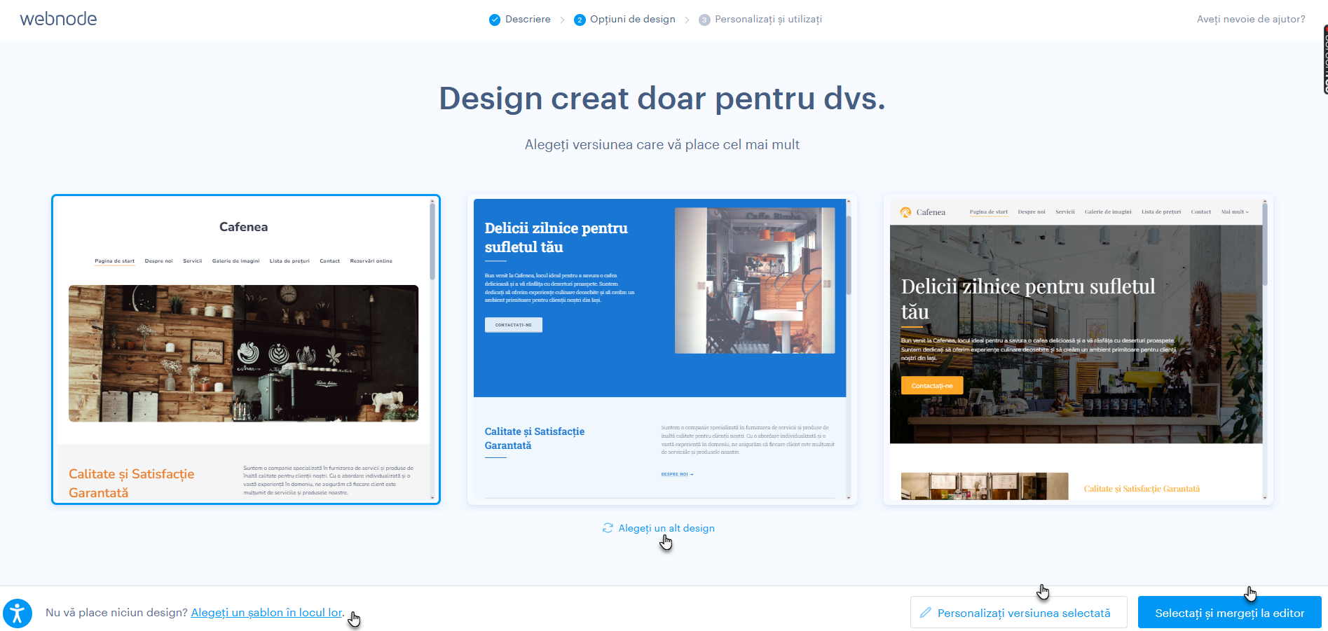 5. Aici puteți alege unul dintre designurile generate de inteligența artificială și îl puteți ajusta folosind butonul Personalizați versiunea selectată. De asemenea, puteți încerca să generați noi designuri folosind butonul Obțineți mai multe designuri (puteți reveni la designurile selectate anterior). Dacă doriți să alegeți unul dintre șabloanele Webnode, faceți clic pe butonul Alegeți un șablon în schimb.