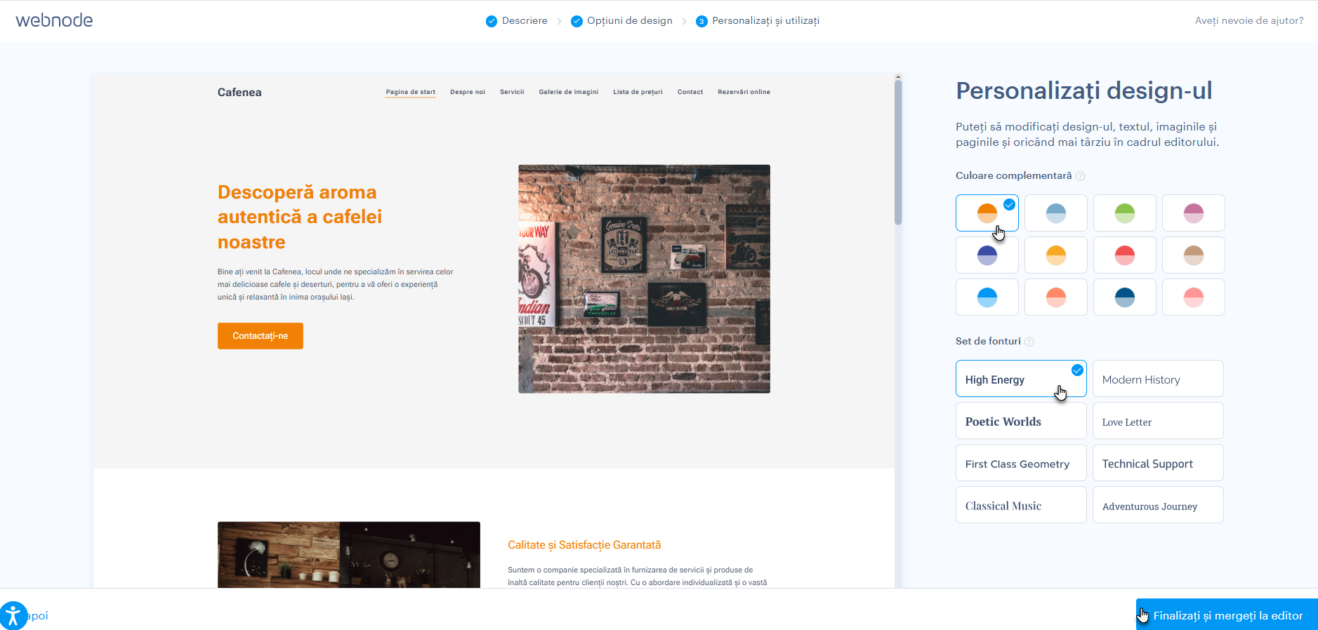 6. Când ajustați designurile generate, puteți alege culoarea site-ului web și fontul utilizat pe pagini.