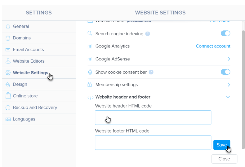 2. 2. Accesați Setări site web și găsiți antetul/subsolul HTML în partea dreaptă și lipiți codul în fereastra pregătită. Apoi faceți clic pe Salvare și publicați modificările.