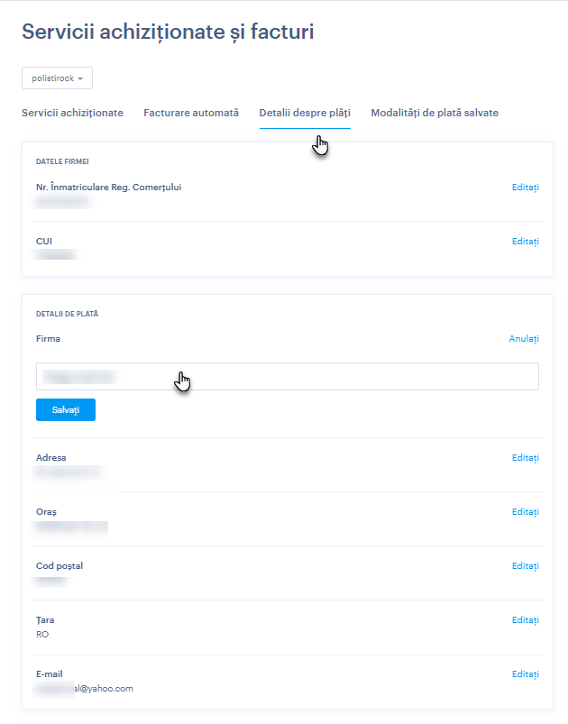 Informațiile de facturare pot fi modificate direct în administrarea proiectului sau atunci când plasați o nouă comandă, fie pentru un domeniu, fie pentru un plan premium. Dacă aveți un abonament automat activ pentru serviciul respectiv, va trebui mai întâi să îl dezactivați și apoi să creați o nouă comandă cu informațiile de facturare corecte. Mai multe informații despre abonamente puteți găsi în articolul Informații despre reînnoirile automate.