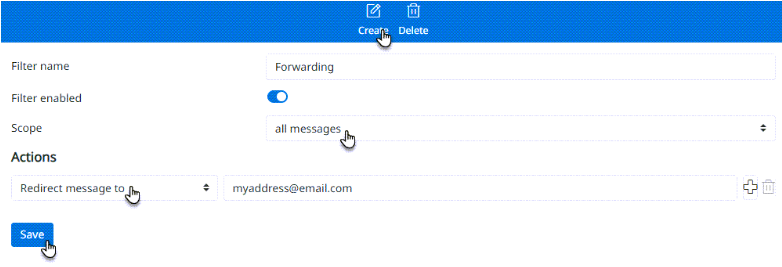 3. Faceți clic pe butonul Creați din colțul din dreapta sus. Apoi introduceți un nume pentru filtru. Selectați Toate mesajele ca Domeniu de aplicare, setați Redirecționați mesajul către ca Acțiune și introduceți adresa de e-mail către care doriți să fie redirecționate e-mailurile.