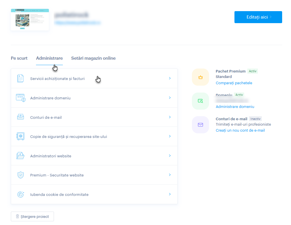 1. În administrarea proiectului, faceți clic pe fila Administrare, apoi selectați Servicii achiziționate și facturare.