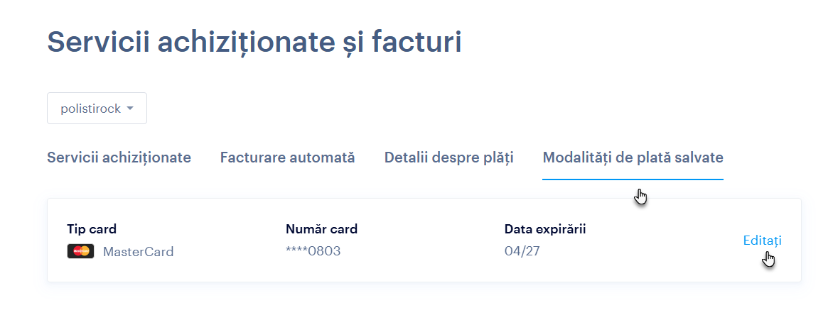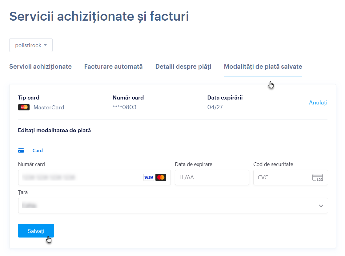 În acest ghid, veți afla cum să modificați metodele de plată salvate (carduri de plată). Un card de plată trebuie actualizat separat pentru fiecare proiect, chiar dacă a fost utilizat în mai multe proiecte. Dacă modificați cardul, acesta va fi actualizat pentru toate abonamentele din proiectul respectiv care au fost plătite cu cardul respectiv. Un card poate fi modificat numai dacă există un abonament automat activ în curs de desfășurare în cadrul proiectului.