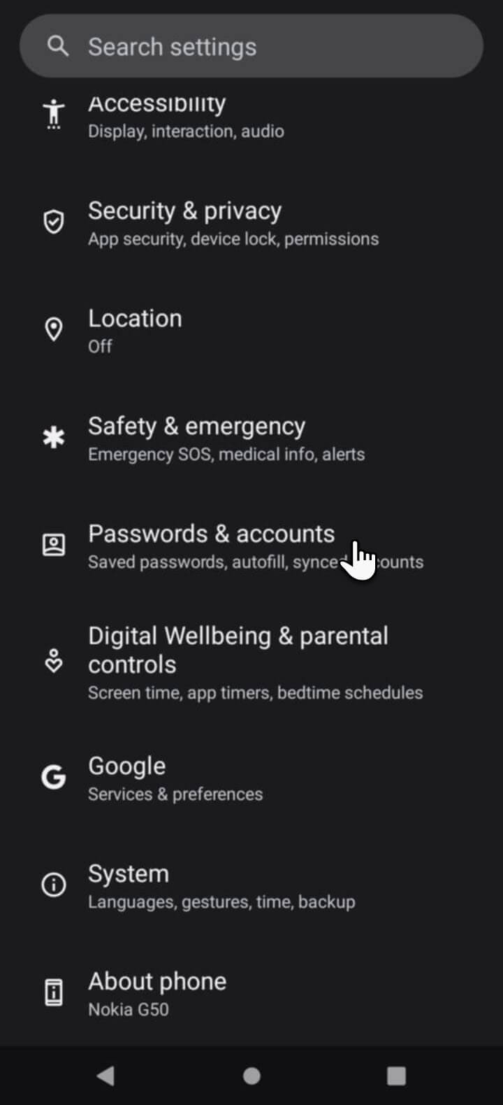 1. Pe telefonul dvs., deschideți Setari (Settings) și selectați Parola & Cont (Passwords & Accounts).