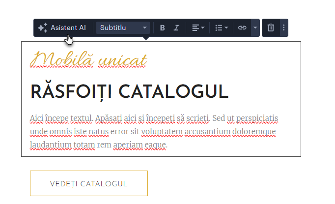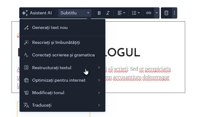 În acest ghid, veți învăța cum să editați texte în editorul Webnode folosind inteligența artificială. Acest instrument vă ajută să asigurați coerența stilistică, să accelerați crearea textelor de marketing și, în general, să vă ușurați munca.