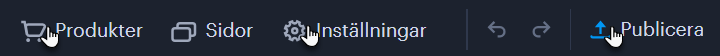 1. Det översta fältet innehåller knappar för Produkter, Sidor, Inställningar och Publicera.